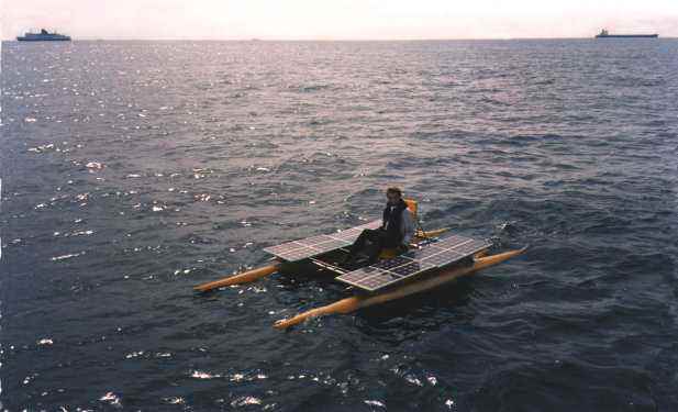 Theo Schmidt is one of the earliest developers of solar boats. With this catamaran he realised the first almost-crossing of the English Channel in 1987 (a couple of miles missing). This boat runs at exactly 10 km/h under full sunlight without battery. (In 1997 Englishman Malcolm Moss realised the first complete crossing with a somewhat larger catamaran).